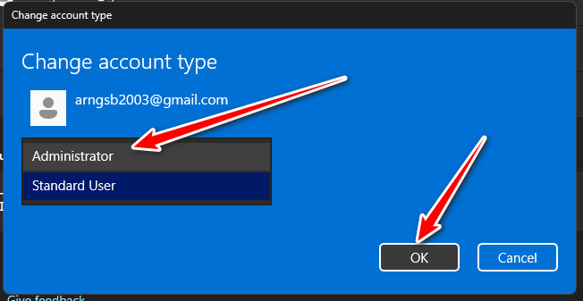 - Set it to Administrator, then sign out and log in using this new profile.