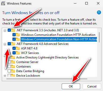 - Check both boxes (including all sub-options), then click OK and let Windows install the required components.