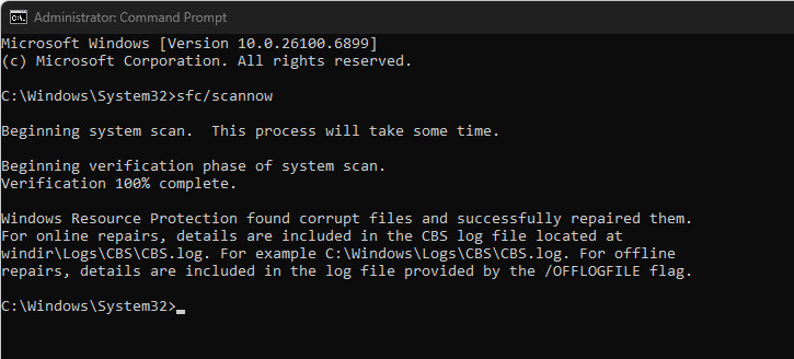 If .NET Framework files are damaged or missing, Windows may falsely detect them as installed. Running the System File Checker (SFC) scan ensures all protected files, including .NET components, are verified and replaced automatically when needed.