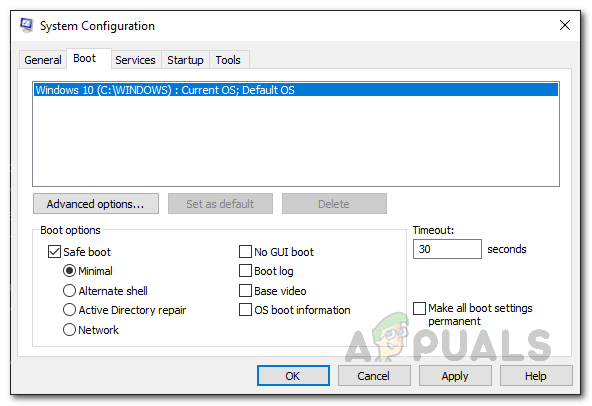 Running MSCONFIG - Head over to the Boot tab and check the box labeled as Safe boot inside Boot options. Hit Apply and OK button afterwards.