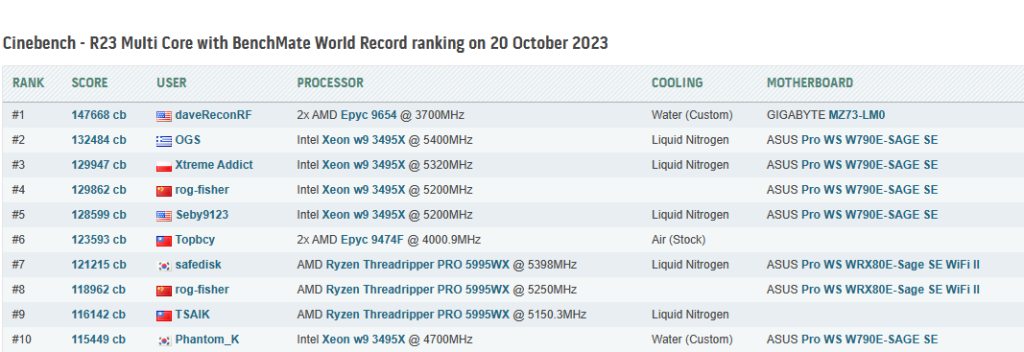 To put this insane number into perspective, here’s a list of the fastest CPUs in the world (HWBot, CBR23). The world record is currently (at least officially) held by the EPYC 9654, AMD’s EPYC Genoa server flagship standing at 147.7k points. Well, today AMD has officially dethroned itself with the Threadripper PRO 7995WX amassing 148.7k points.