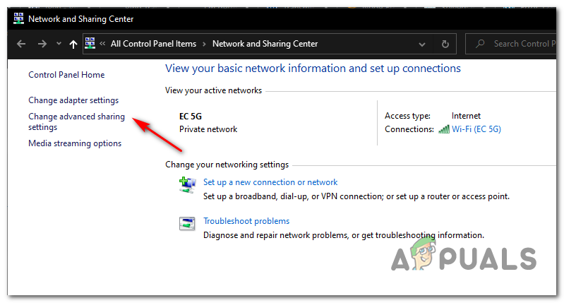 Opening the Network and Sharing Center using a Run command - Inside the Network and Sharing Center, click on Change advanced sharing center from the vertical menu on the left.