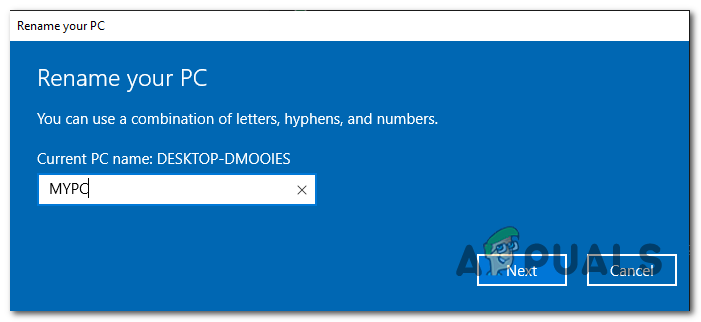 Renaming the PC on Windows 10 - Inside the Rename your PC, enter an upper case only name for your machine and hit Next.