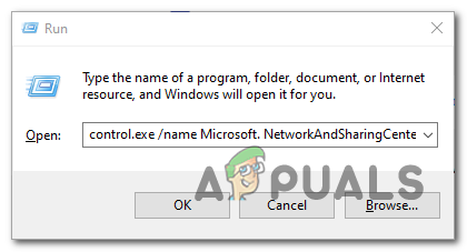 - Press Windows key + R to open up a Run dialog box. Next, type ‘control.exe /name Microsoft.NetworkAndSharingCenter‘ inside the run box to open up the Network and Sharing Center menu.