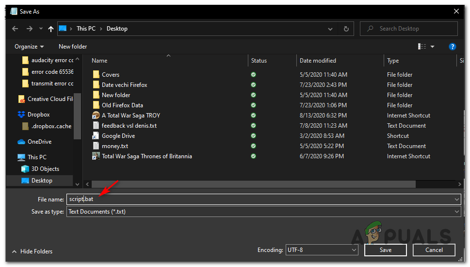 Using the Save As menu - Choose a location where to save this script and name it however you want, but make sure that the name ends with the extension .bat before clicking Save.
