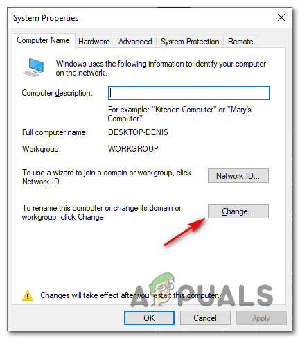 Run dialog: sysdm.cpl - Once you’re inside the System Properties screen, click on the Computer Name tab, then click on the Change button.