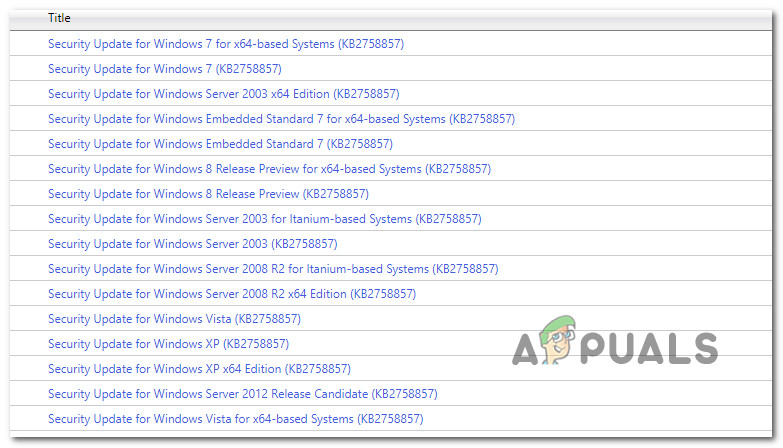 Finding the KB2758857 Update - Next, look through the list of results and decide on the appropriate update version that you need to install keeping in mind your current OS architecture and the Windows version that you’re using.