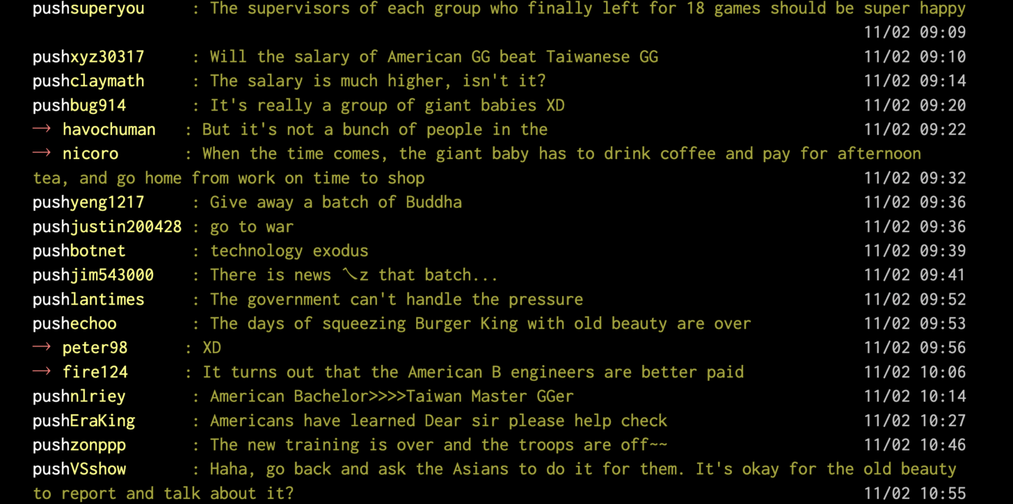 Commenters on PTT said that despite restrictions forbidding smoking within the buildings, their American counterparts continued to do so and that the area “from the dormitory to the pantry is full of smoke.” Some people referred to the American engineers as “a group of giant babies.” Others, however, made fun of the fact that “slaves are used to being slaves, and those who demand normal welfare are giant babies in the eyes of slaves.”