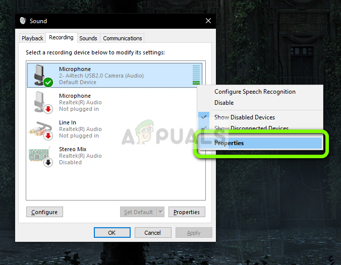 Selecting Default Microphone - Click on Properties in the resulting context menu.