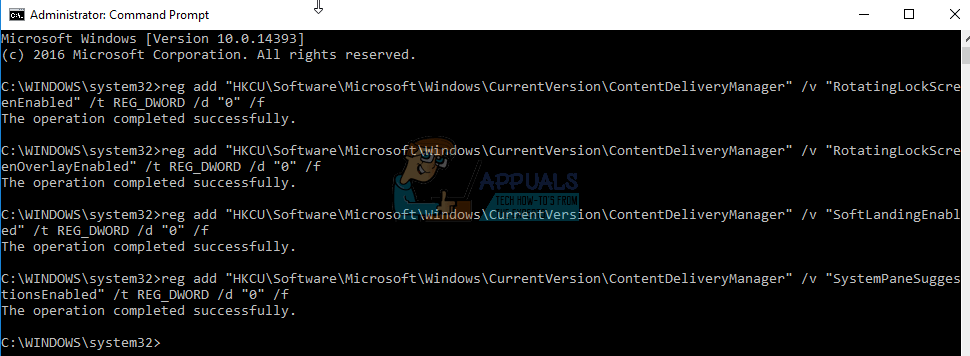 reg add “HKCU\Software\Microsoft\Windows\CurrentVersion\ContentDeliveryManager” /v “SoftLandingEnabled” /t REG_DWORD /d “0” /f