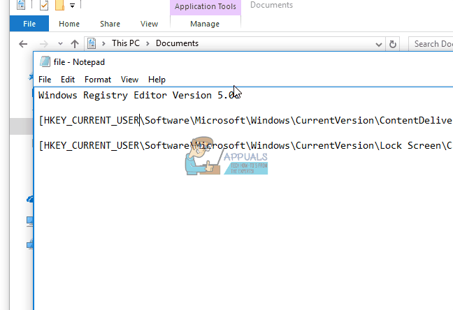 - Copy and paste the key below into the notepad editor window.Windows Registry Editor Version 5.00[HKEY_CURRENT_USER\Software\Microsoft\Windows\CurrentVersion\ContentDeliveryManager] “RotatingLockScreenEnabled”=dword:00000000 “RotatingLockScreenOverlayEnabled”=dword:00000000[HKEY_CURRENT_USER\Software\Microsoft\Windows\CurrentVersion\Lock Screen\Creative] “LockImageFlags”=dword:00000000 “CreativeId”=”” “PortraitAssetPath”=”” “LandscapeAssetPath”=”” “PlacementId”=”” “ImpressionToken”=”” “HotspotImageFolderPath”=”” “CreativeJson”=””