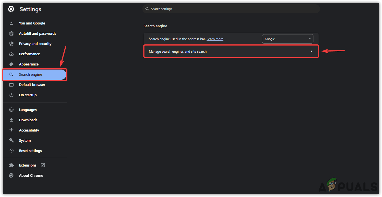 - Go to Search Engine from the left sidebar. Here, click Manage Search Engines and Site Search.