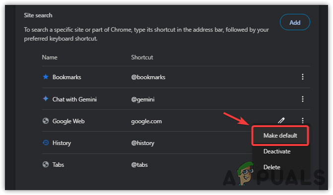 - Once done, click Add. Then, click the three dots associated with the site search that you just created, then select Make it default.