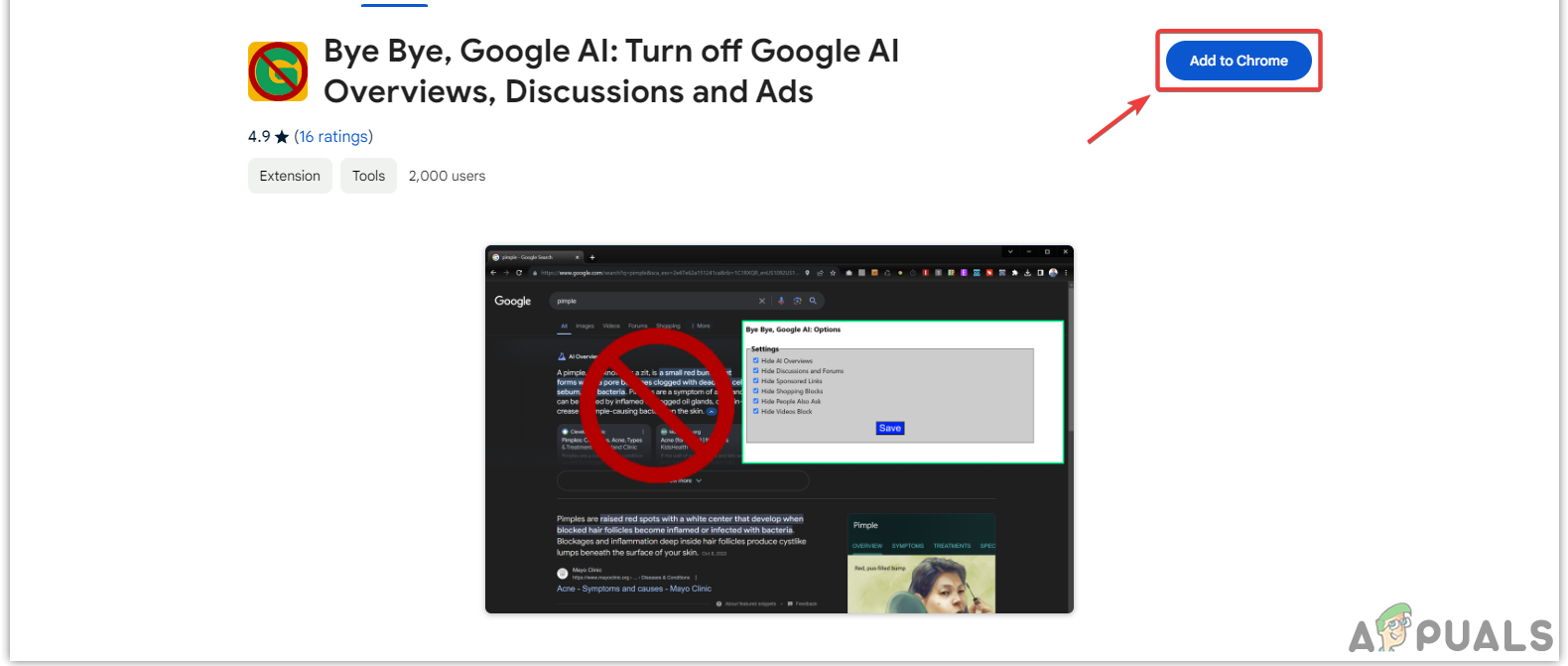 - Click Chrome Web Store and search for Bye Bye, Google AI. Now, add it to your browser.