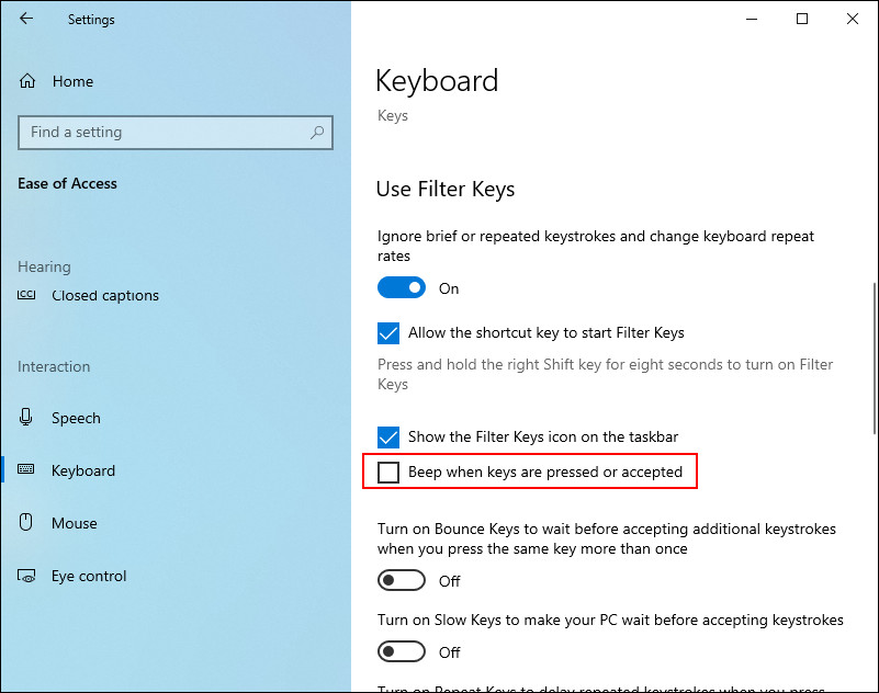 Turn Toggle On - Then, head over to the Use Filter Keys section and uncheck the box associated with Beep when keys are pressed or accepted.