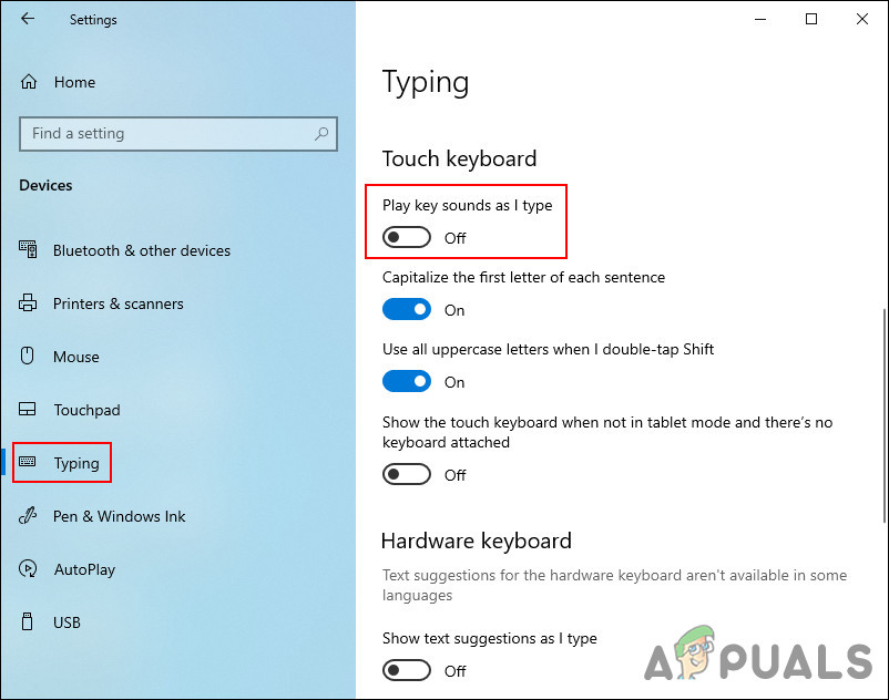 Open Devices in Windows Settings - Choose Typing from the left pane and turn the toggle off for Play key sounds as I type on the right side of the window. This should turn the keyboard sound off.
