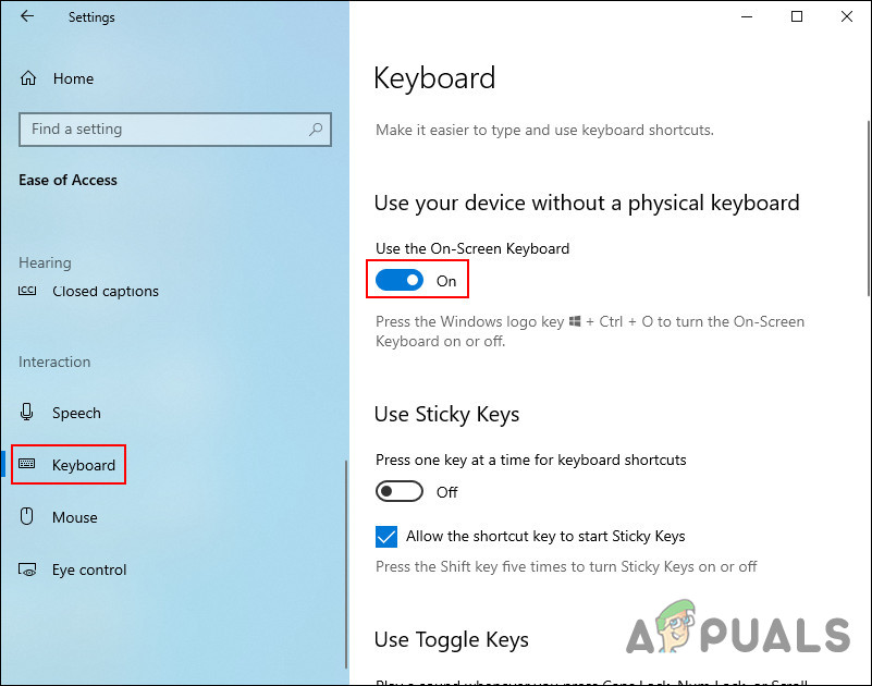 Select Ease of Access in the Windows Settings screen - Then, choose Keyboard from the left panel and turn the toggle on for Use the On-screen Keyboard as shown below.