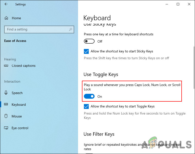 - Now, head over to the right side of the window and turn the toggle off under Play a sound whenever you press the Caps lock, Num lock, or Scroll lock keys.