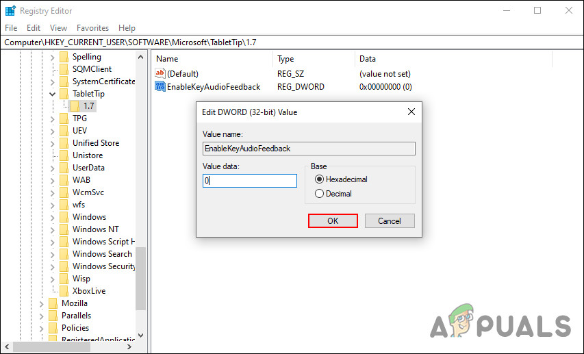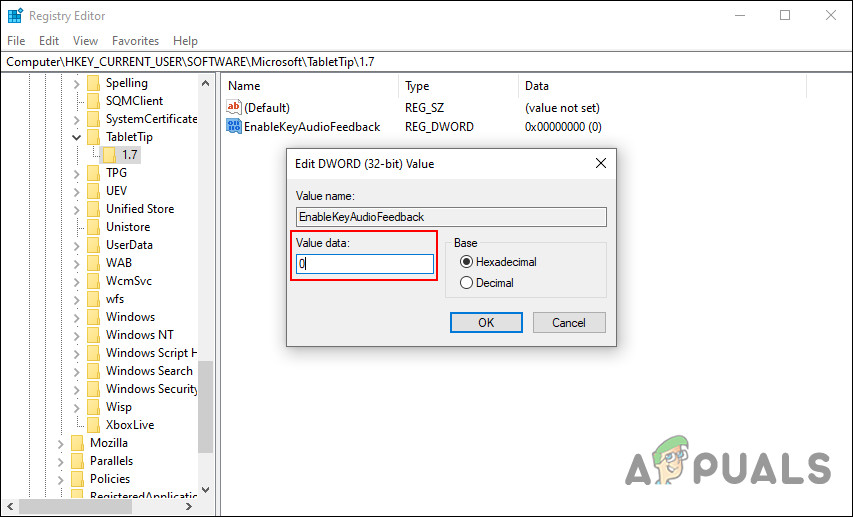 - Double-click on EnableKeyAudioFeedback and under Value data, type 0.
