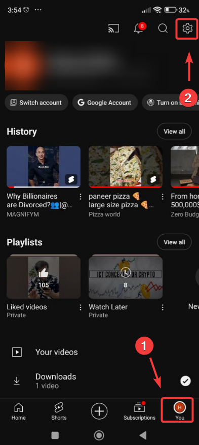 - Open the YouTube App and tap on the profile icon from the bottom right.