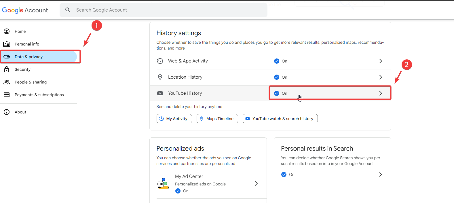 - Select Data & Privacy from the left and scroll down to the History Settings.