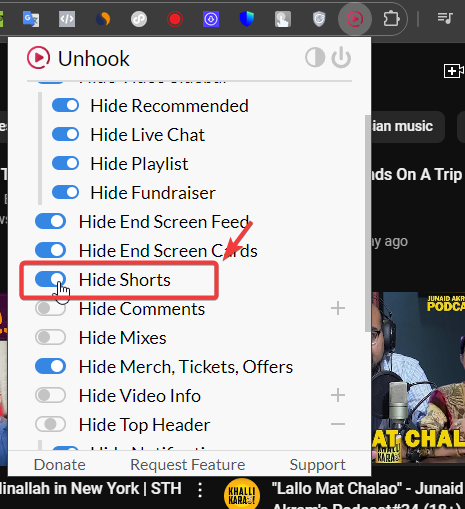 - If you only want to hide Shorts, you can simply click on the Unhook extension from the top and turn off all the features except Shorts.