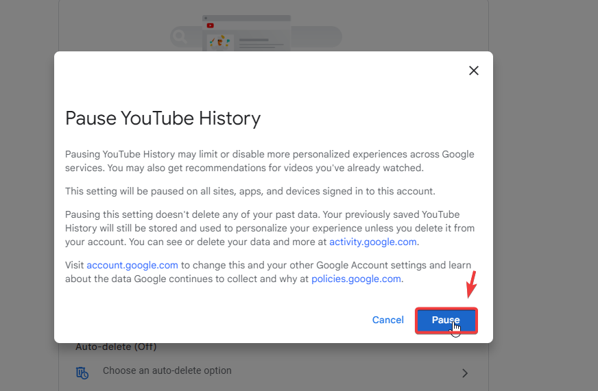 - YouTube will ask for confirmation; simply tap Pause to proceed.