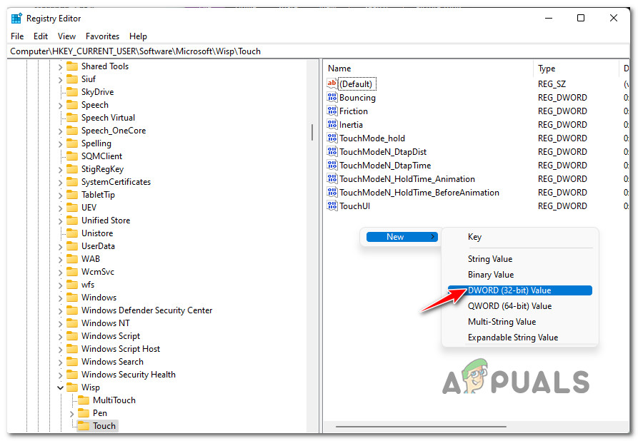 Creating a new DWORD value - Once the new DWORD is created, name it TouchGate.