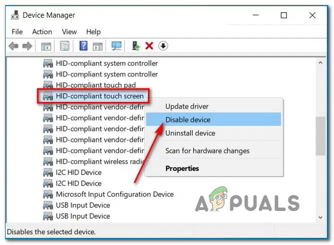 - Right-click on HID-compliant touch screen (or whatever the name is in your particular driver is) and then click on Disable Device from the context menu that just appeared.