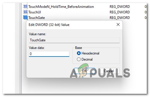 - Next, double-click on the newly created TouchGate value, then set the Base to Hexadecimal and the Value data to 0 in order to disable the touch screen functionality.