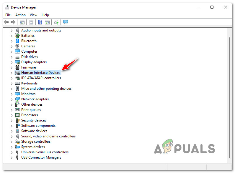 - Once you’re inside Device Manager, scroll through the different categories of devices and expand the drop-down menu associated with Human Interface Devices.