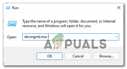- Press Windows key + R to open up a Run dialog box. Next, type ‘devmgmt.msc’ inside the text box and press Ctrl + Shift + Enter to open up Device Manager with admin access.