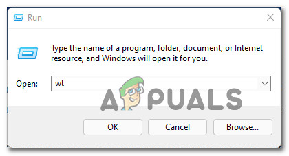 - Press Windows key + R to open up a Run dialog box. Inside the text box that just appeared, type ‘wt’ and press Ctrl + Shift + Enter to open up the Windows Terminal app.