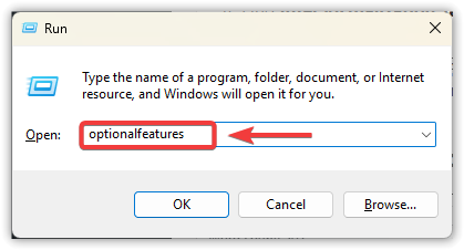 - Press Windows + R, type optionalfeatures, and press Enter.