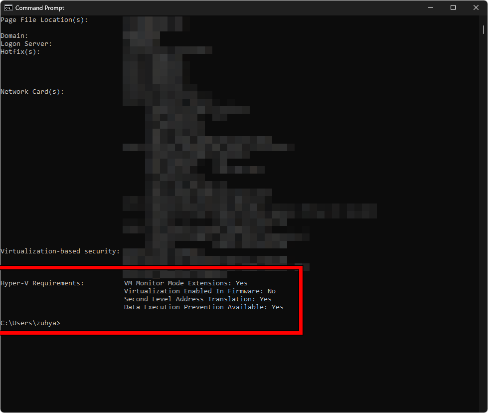 Scroll to Hyper-V Requirements. If it shows Virtualization Enabled In Firmware: Yes, BIOS virtualization is on. If it says No, go to Fix 2.