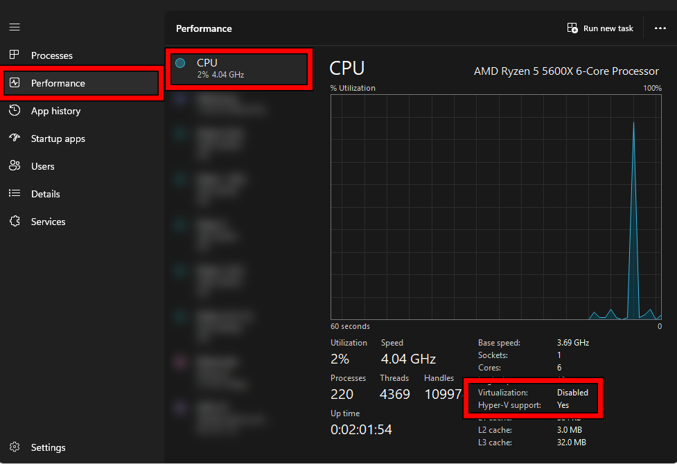A) Check Task Manager (BIOS/UEFI Virtualization)