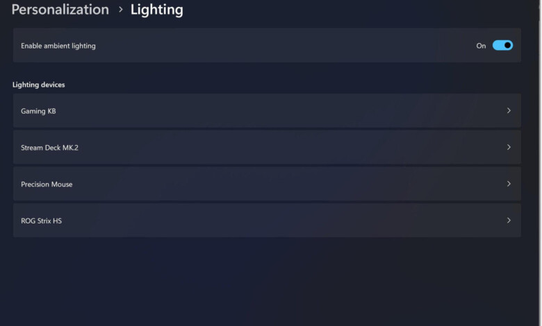 - In the Settings app, navigate to the “Personalization” section and locate the new “Lighting” page. Here, you can access various RGB settings such as brightness, effects, color, and more.