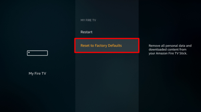 Accessing the My Fire TV menu - From the My Fire TV menu, scroll down through the list of available options and choose Reset to Factory Defaults.