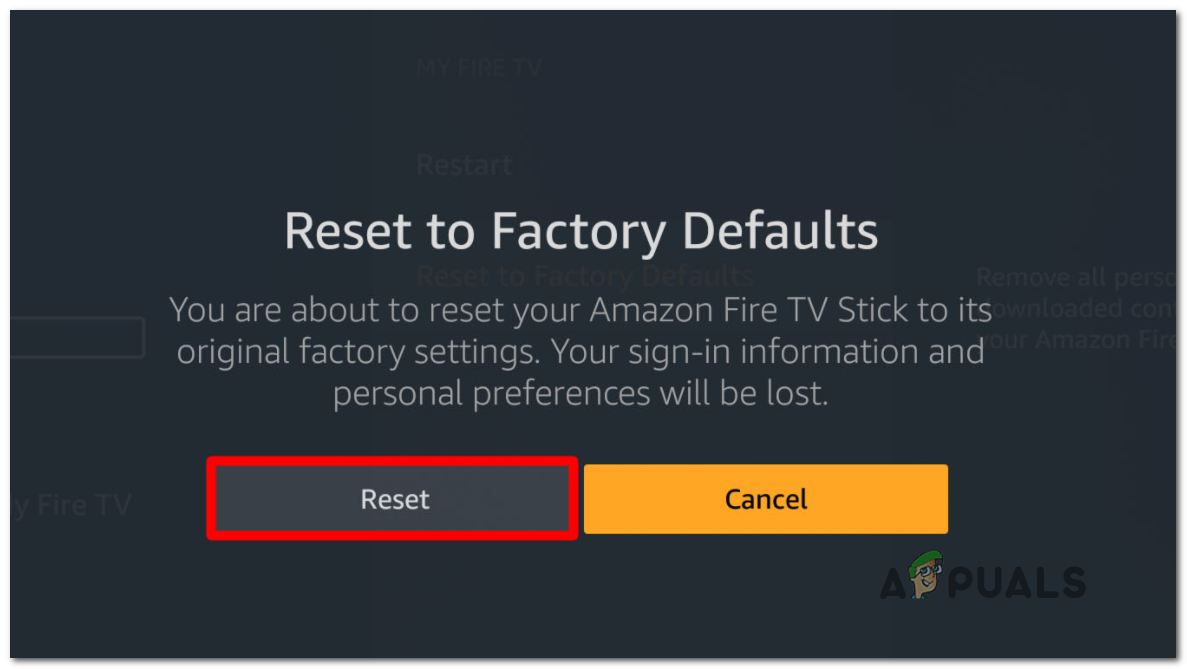 Resetting your Fire TV to factory defaults - At the final confirmation window, choose Reset and wait until you get the confirmation that the device was successfully reset to its factory defaults.