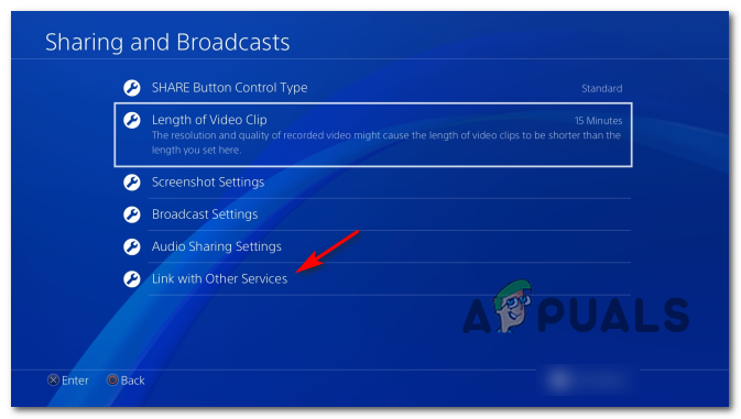 Settings in PS4 - Once you’re inside the Settings menu, access the Sharing and Broadcast menu. Once you’re inside this menu, access the Link with Other Services.