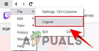 Click Logout option - Then, close the Twitch application as clicking the ‘X’icon won’t close it completely. So, in this case, you need to head to the File option by clicking the hamburger icon, and then you need to click on the Exit
