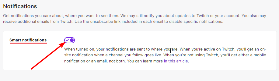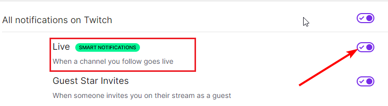 Smart Notification is a system where Twitch chooses which notifications you’ll see based on your activities and preferences. There might be a chance this setting might malfunction, preventing the user from getting all the notifications. Disabling smart notifications ensures you receive all notifications, regardless of Twitch filtering.