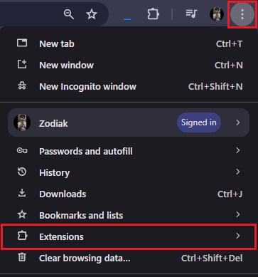 - Open the menu by clicking on the three vertical dots at the top right corner, then select Extensions from the dropdown.