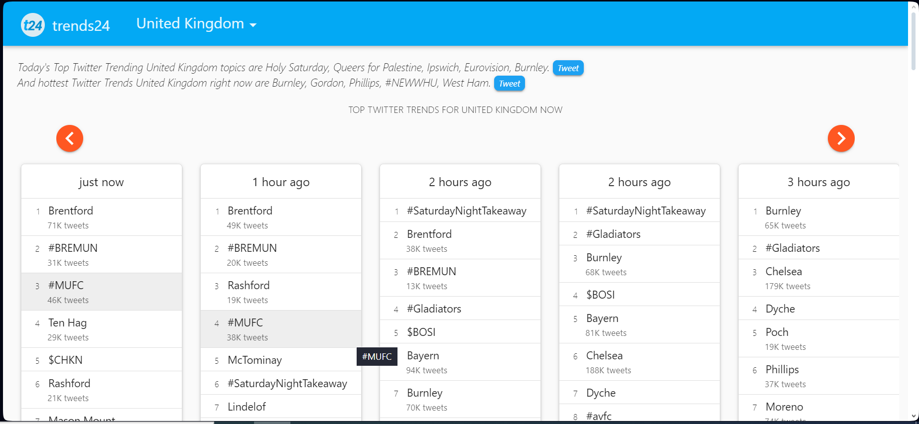 Trends24 highlights trending topics, keywords, and hashtags on X (formerly Twitter) without any need for registration. This platform enables you to monitor what’s trending worldwide and by specific location. However, to see individual tweets for each trend, you will need to log in to Twitter.