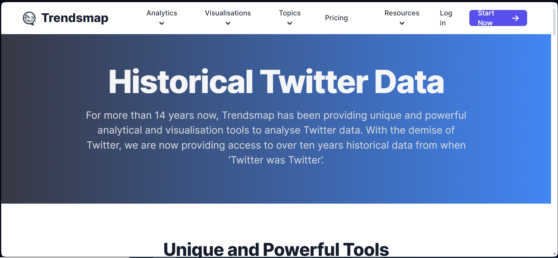 Trendsmap is an in-depth analytics service that provides access to historical Twitter data, reaching up to ten years back, even without an account. It offers a streamlined interface for keyword research, along with detailed analytics and visual mapping of trends. Please note, access to full analytics may require a subscription.