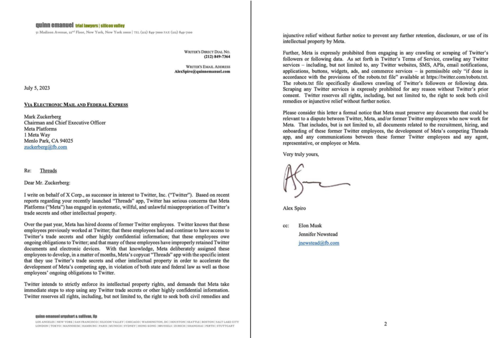 Twitter intends to strictly enforce its intellectual property rights, and demands that Meta take immediate steps to stop using any Twitter trade secrets or other highly confidential information.”