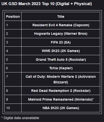 According to the sales data for March 2023, overall game sales were slightly down by 3% compared to the same month last year, with a total of 2.7 million digital and physical games sold, according to GSD data. However, the remake of Resident Evil 4 claimed the top spot, despite its late launch in the month.