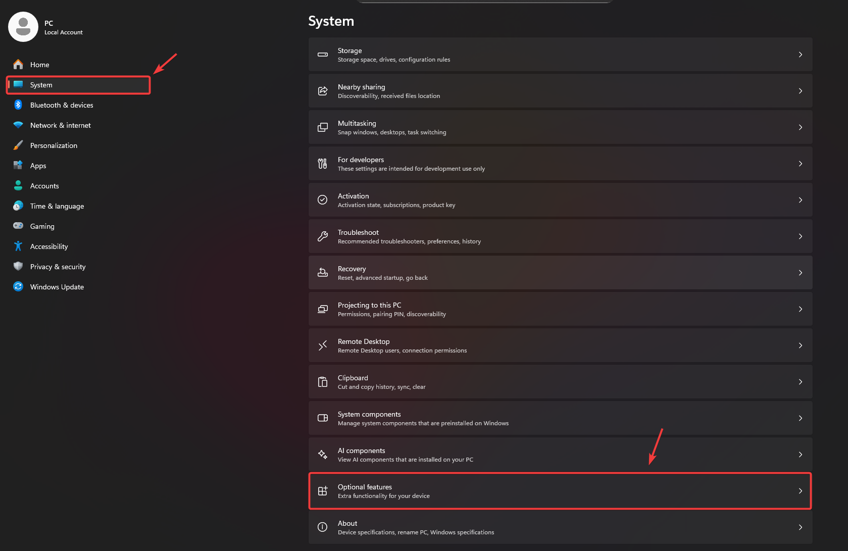 - Go to System > Optional features.