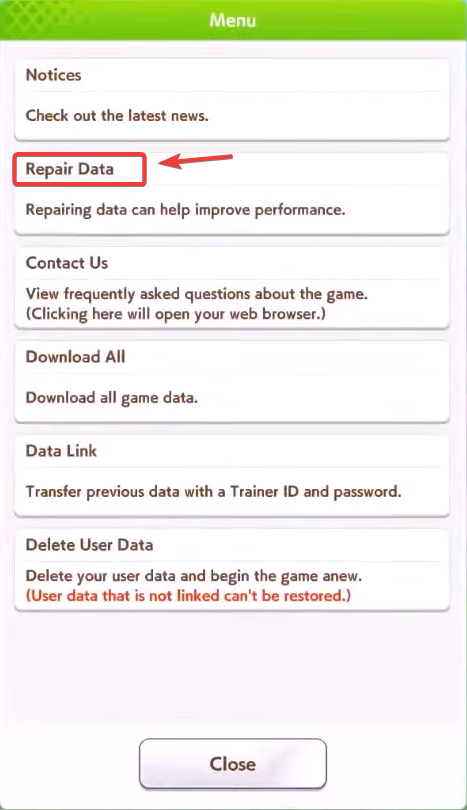 - Select Repair Data.