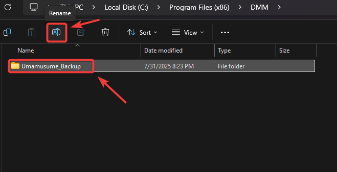- Right-click the folder named Umamusume, select Rename, and change the name (e.g., Umamusume_Backup).